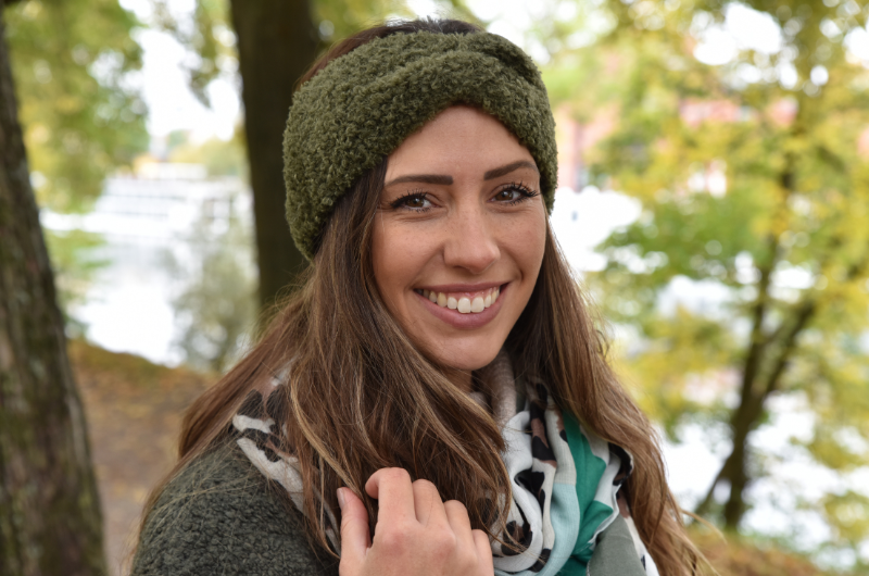 Das passende Stirnband aus Teddyplüsch hält nicht nur warm, sondern rundet den Look auch modisch ab. Kleine Details wie die Textur des Materials schaffen Tiefe und setzen Highlights im monochromen Khaki-Look. Es ist das perfekte Accessoire für kalte Wintertage, das gleichzeitig praktisch und stylisch ist.
