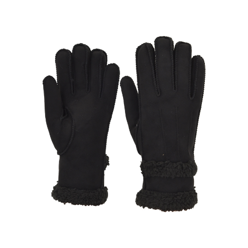 Praktisch kann auch stylisch sein: Die schwarzen Handschuhe mit Teddyfell bringen nicht nur Wärme, sondern auch eine Portion Cozy-Vibes in den Look. Die weiche Textur bildet einen spannenden Kontrast zu den glatten Materialien von Bluse und Weste und sorgt für Tiefe und Gemütlichkeit – ideal für kühlere Übergangstage.