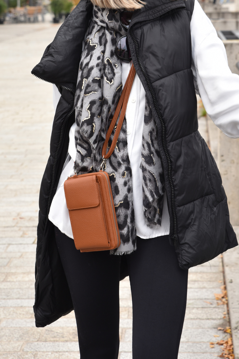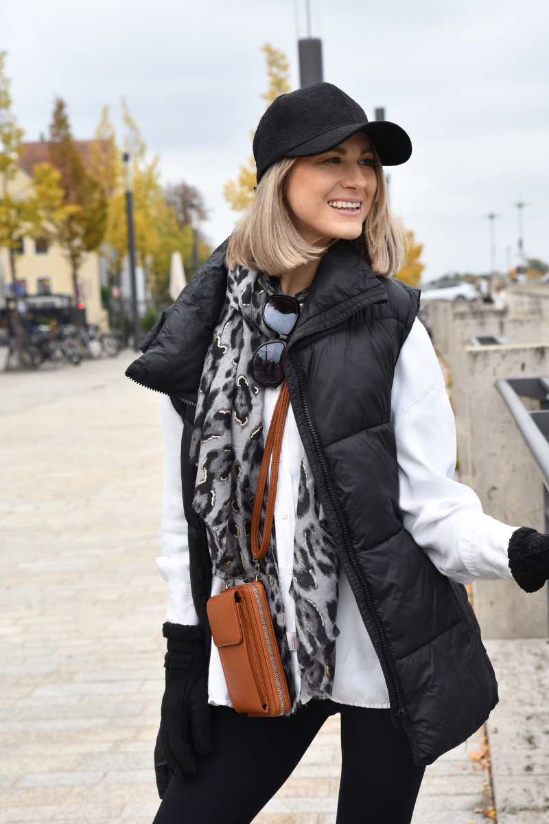 Weiße Bluse und schwarze Steppweste sind echte Allrounder für die Übergangszeit. Die Bluse bringt Leichtigkeit und Eleganz ins Outfit, während die Steppweste für Wärme sorgt, ohne zu schwer zu wirken. Zusammen schaffen sie eine perfekte Leinwand für spannende Accessoires – schlicht genug, um Akzente wirken zu lassen, aber niemals langweilig.