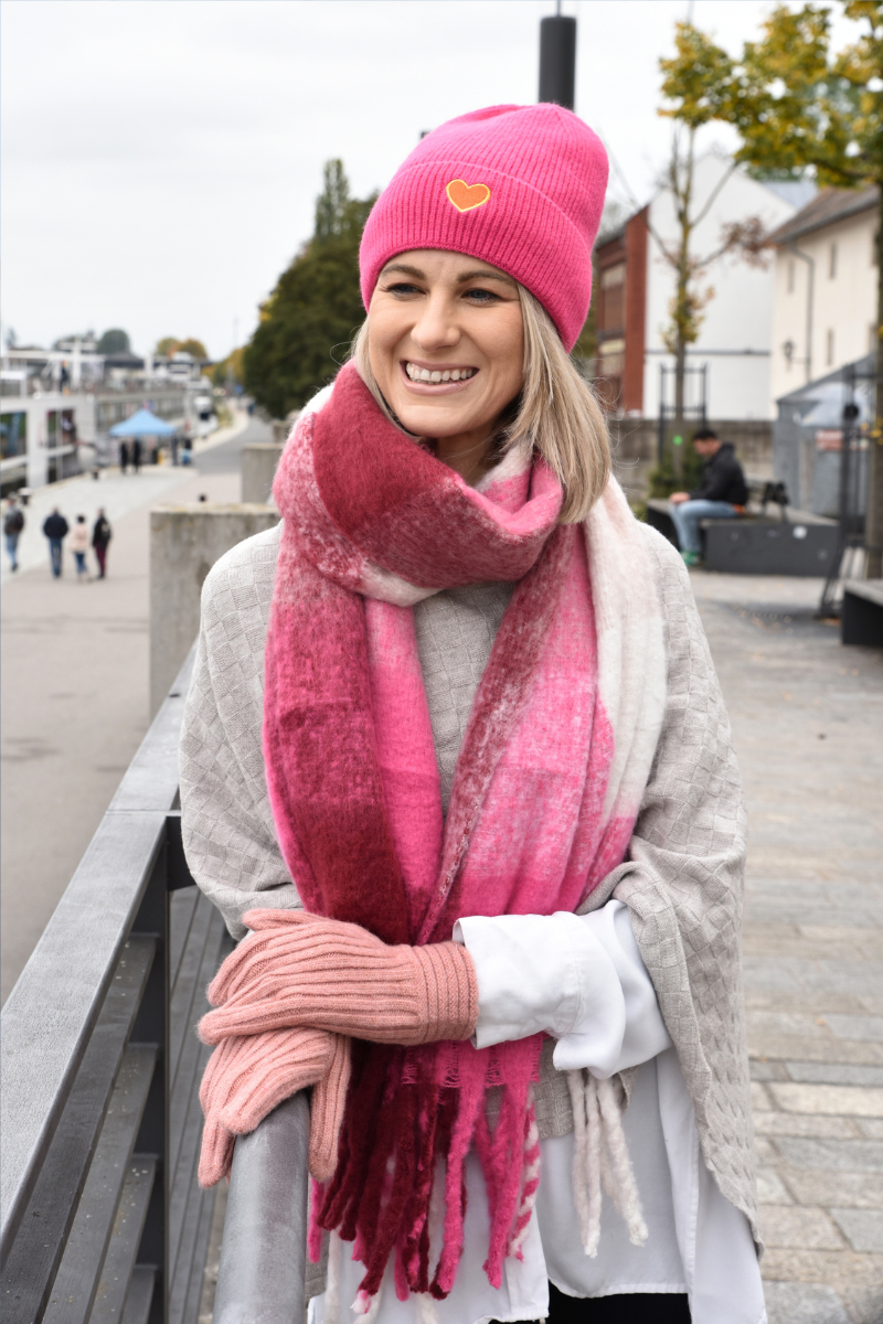 Die Basis des Looks bildet eine pinke Strickmütze mit einer verspielten Herz-Stickapplikation. Sie ist nicht nur ein kuscheliger Wärmespender, sondern auch ein Statement-Piece. Das kleine Herz sorgt für einen liebevollen, femininen Touch – perfekt, um schlichte Herbstoutfits aufzupeppen. Kombiniert mit einem cremefarbenen Mantel oder einer schwarzen Steppjacke wird die Mütze zum Eyecatcher.