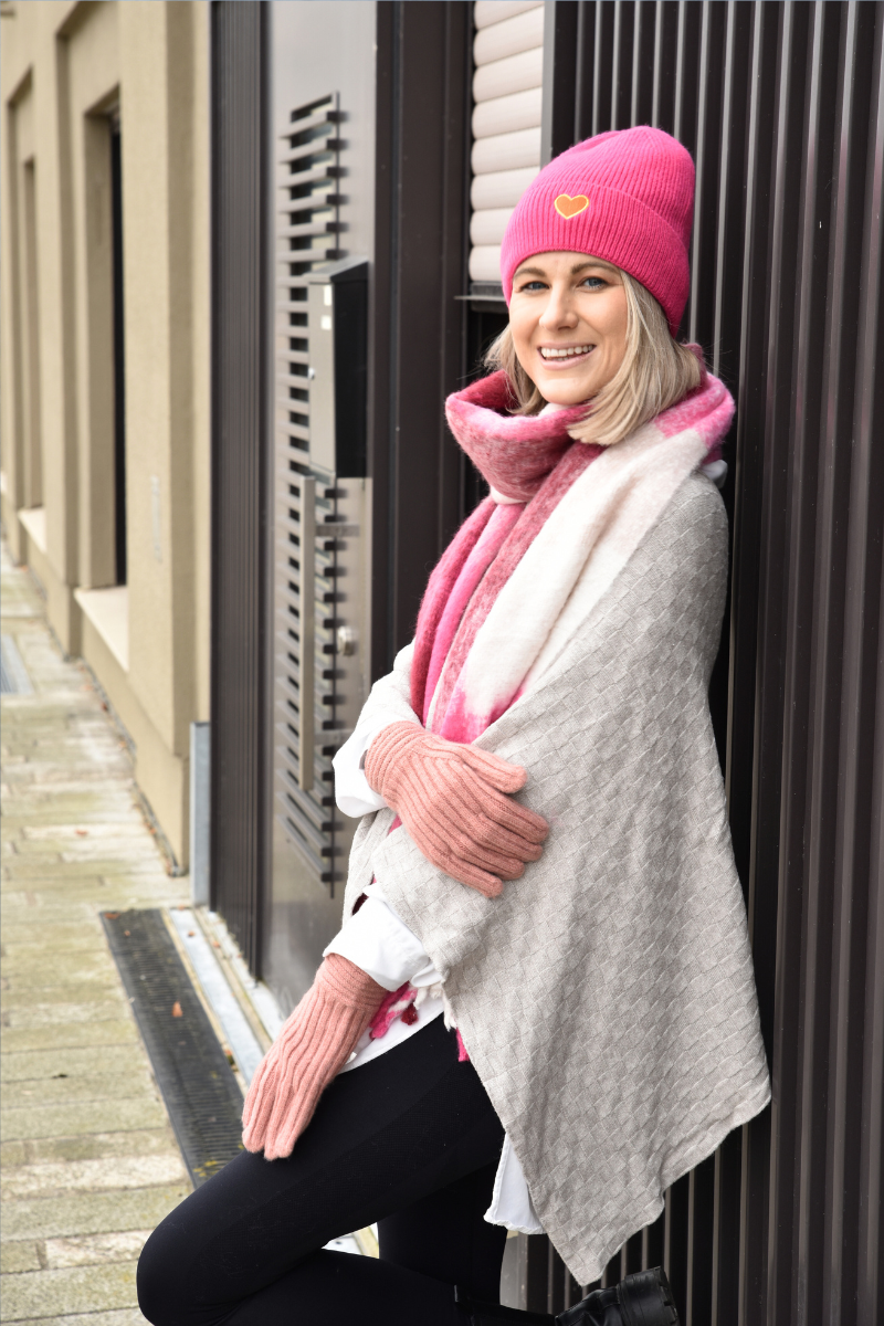 Die hellrosa Rippstrick-Handschuhe runden den Look sanft ab. Sie bringen eine Prise Romantik ins Spiel und fügen sich wunderbar in die pinken Nuancen von Mütze und Schal ein. Ihr minimalistisches Design lässt sie vielseitig kombinieren – ob zum Spaziergang im Park oder zum Stadtbummel am Wochenende.