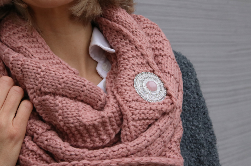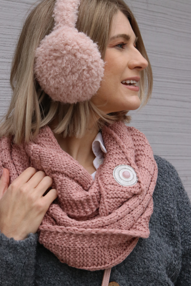Ein kuschliger Winterlook wäre nicht komplett ohne einen rosa Strickloop, der den Hals schön warm hält und gleichzeitig das Farbschema aufgreift.